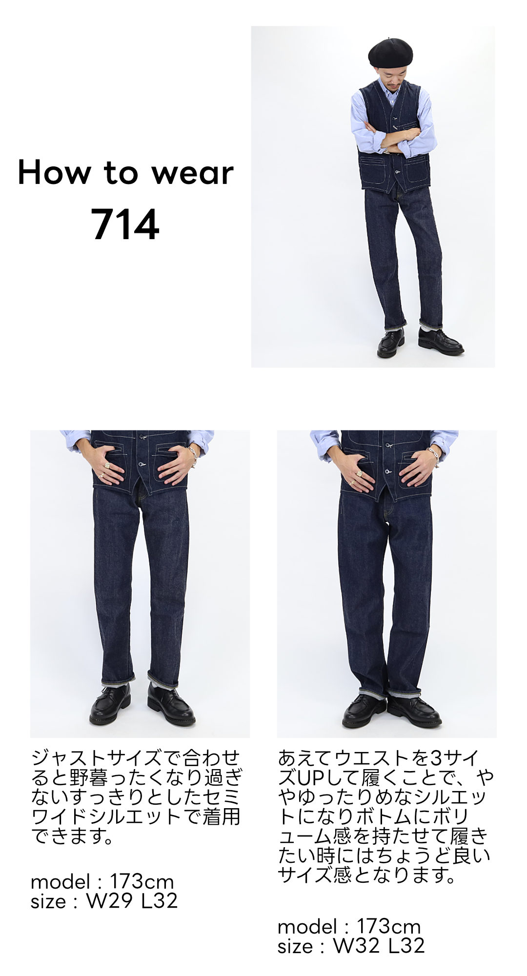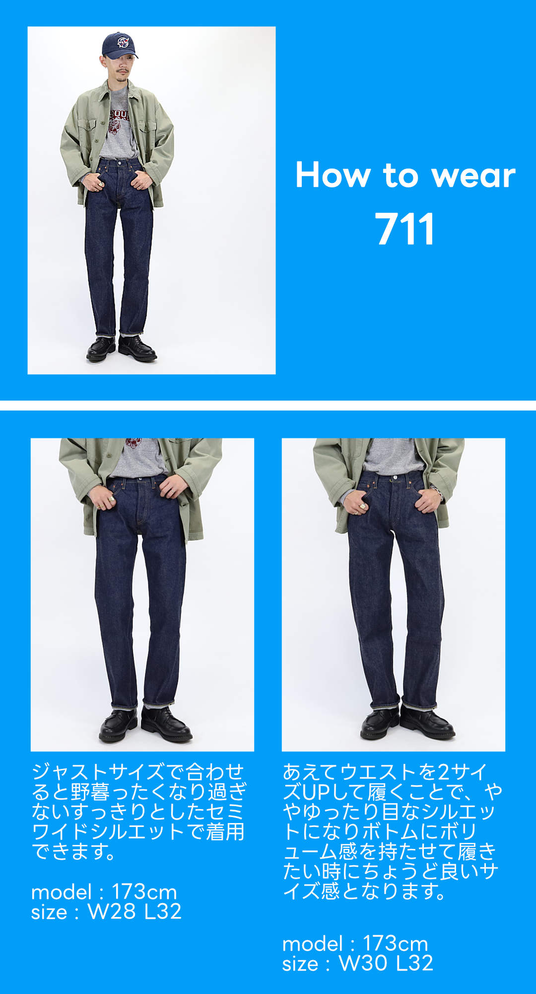 710とは対照的なやや太めのストレートシルエット。腰周りやお尻周りの野暮ったさが抑えられた、太めのシルエット。