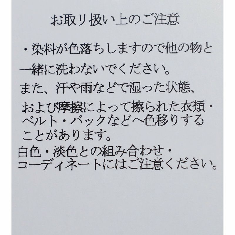 摩擦された所が色落ちします。擦られた衣類・ベルト・バッグ・鞄などへ色移りします。