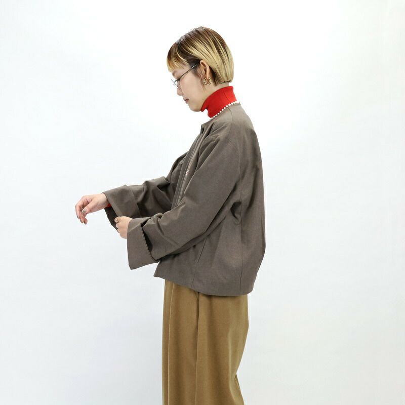 ワイドな身幅が特徴のショート丈カラーレスジャケットのご紹介です。