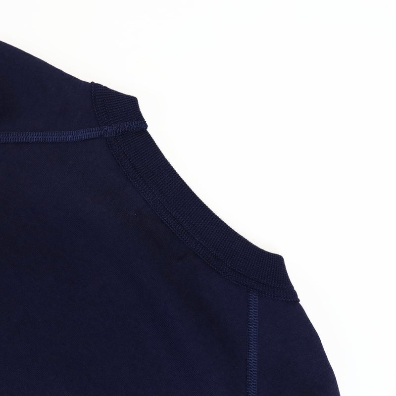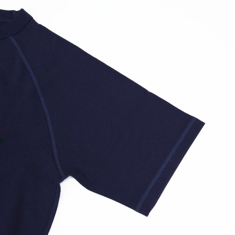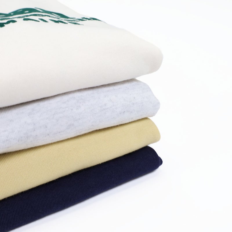 1970年代のアメリカのアスレチックウエアをデザインベースに、表面は綿、裏面は綿/ポリエステル糸を使用した、ほど良い厚さのオリジナルのダブルフェイス・ジャージー素材を使用した半袖スウェット。