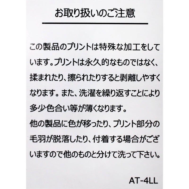 ・他の製品に色が移ったり、プリント部分の毛羽が脱落したり、付着する場合がございますので、他の物と分けて洗ってください
